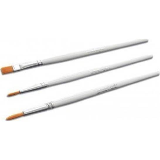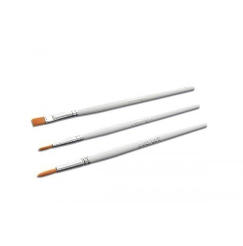Lebensmittelpinsel bestehen aus synthetischen Fasern, die für den Kontakt mit Speisefarben geeignet sind, da sie die Farbe nicht dehnen und die Borsten nicht aus dem Pinsel fallen. Das Set enthält einen dünnen und breiteren Rundpinsel und einen breiteren Flachpinsel.