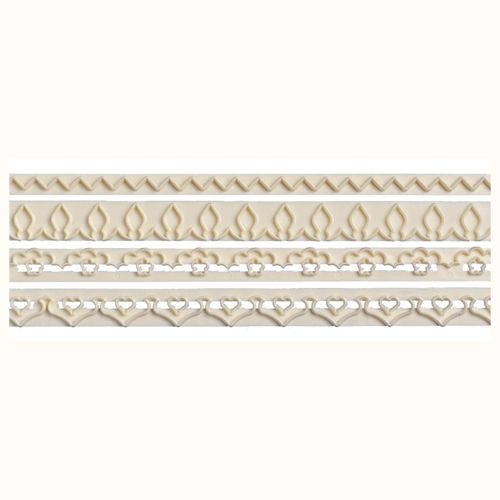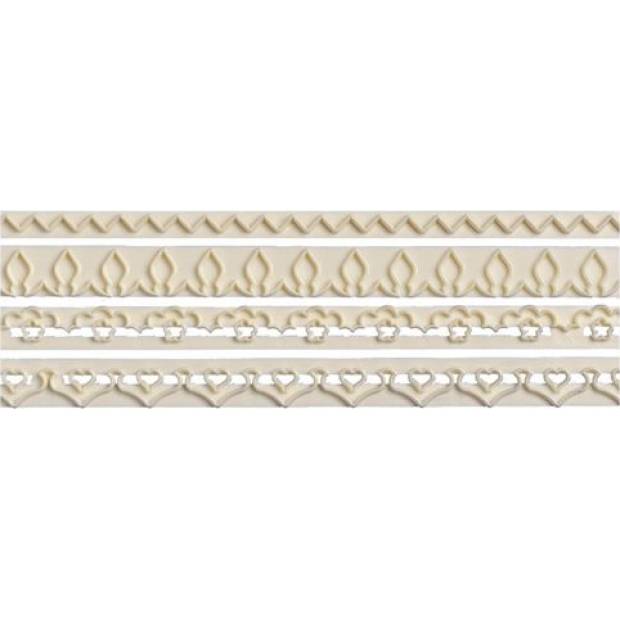 Set mit dekorativen Mustern zum Ausschneiden von Rändern. Für einen traditionellen Effekt, zum Beispiel um Ihrem Tortenboden einen schönen Rand zu geben. Die Größe des Ausschnitts ist 14 x 2 cm.