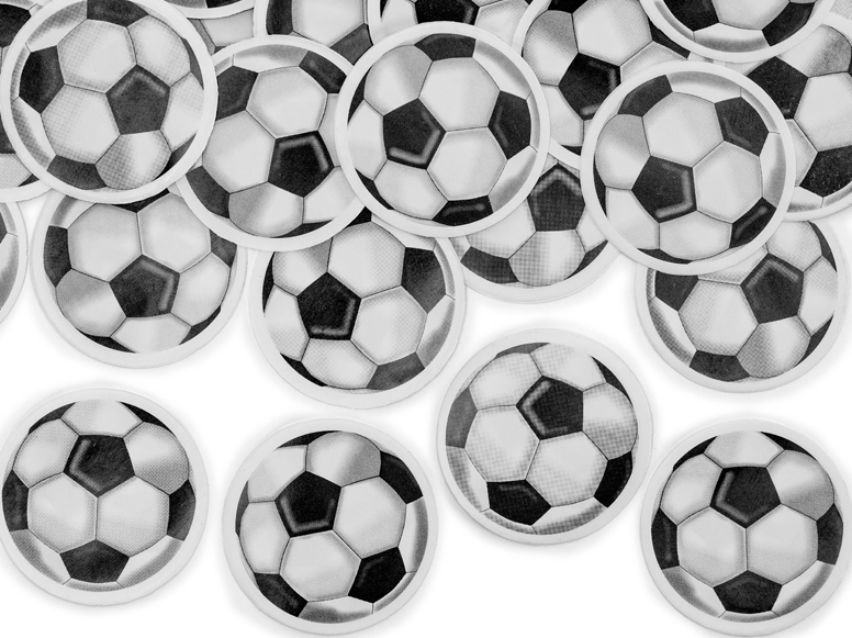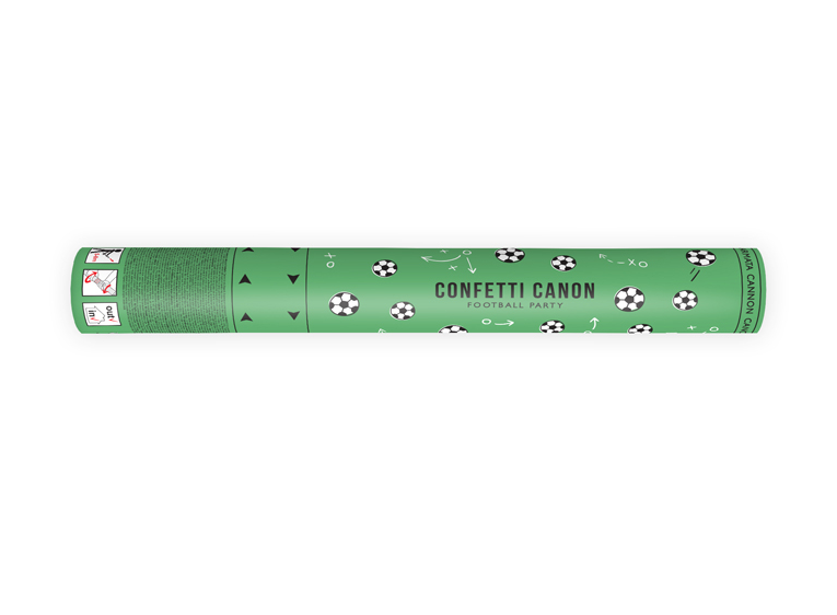 Konfettikanone mit Papierkonfetti in der Form von Fußballbällen.