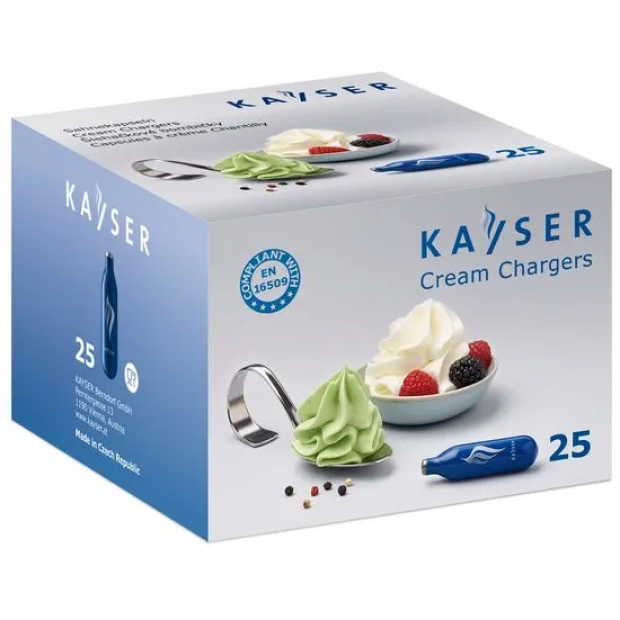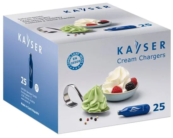 Universelle Sahne-Schnellspüler-Einweg-Bomben werden in der Tschechischen Republik hergestellt. Sie eignen sich für diese Modelle von Sahnespendern: Zum Beispiel: Kayser, Tescoma (Verkauf/Modell ab 2017), Liss, Mosa, Hendi, ISI, Orion, Banquet (Verkauf/Modell ab 2019) und weitere Marken. Für das Aufschlagen von 0,5 l Sahne wird nur eine Bombenkapsel benötigt. Gasreinheit N2O in der Bombenkapsel: 99,95 %. Sahnespänner-Bomben bestehen aus recycelbarem Stahl. Dieses Modell ist blau. Sie sind nicht zum wiederholten Befüllen bestimmt.