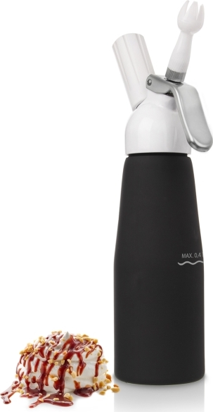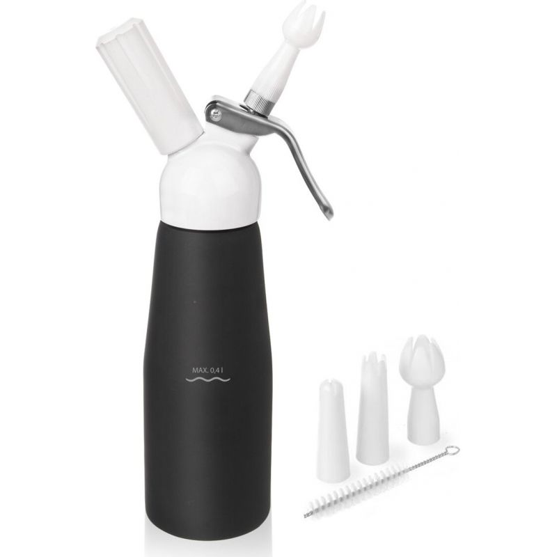 Praktischer Helfer, wie man in kurzer Zeit hochwertige Sahne aus Schlagsahne-Sahnecreme herstellt, ist ein robuster Aluminiumbehälter mit Silikondichtung, mit Schraubkopfe, Düse, drei Aufsätzen und einer Reinigungsbürste. Dank ihnen lässt sich eine luftige Sahnehaube auf Ihren Kuchen, Desserts, Pfannkuchen, Waffeln, Eis- und Obstbechern zaubern, aber Sie glätten auch Saucen und Suppen oder erstellen süße und herzhafte Schäume, Espuma.