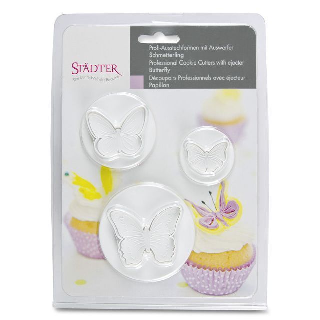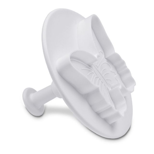 Set von 3 Kunststoff-Ausstechformen aus Plastik in Form von Schmetterlingen. Dekorieren von Kuchen oder Gebäck ist einfach. Die Ausstechform auf den ausgerollten Teig legen, den Schmetterling ohne Betätigung des Pistons ausstechen – nur den Rand der Ausstechform drücken. Die ausgestochene Form bleibt im Inneren und mithilfe des Pistons wird sie herausgedrückt. Mit der Ausstechform können Sie den Kuchen direkt verzieren – die ausgestochene Form auf die Oberfläche des Kuchens legen und einfach den Pistons drücken.