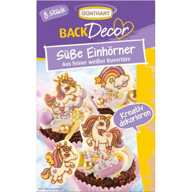 Schokoladen-Dekorationen in Form von beliebten Einhörnern. Sehr einfach dekorieren Sie damit sowohl Kuchen als auch Cupcakes oder sogar Gläser. Bewahren Sie diese Schokoladen-Dekorationen kühl auf, damit sie nicht schmelzen.