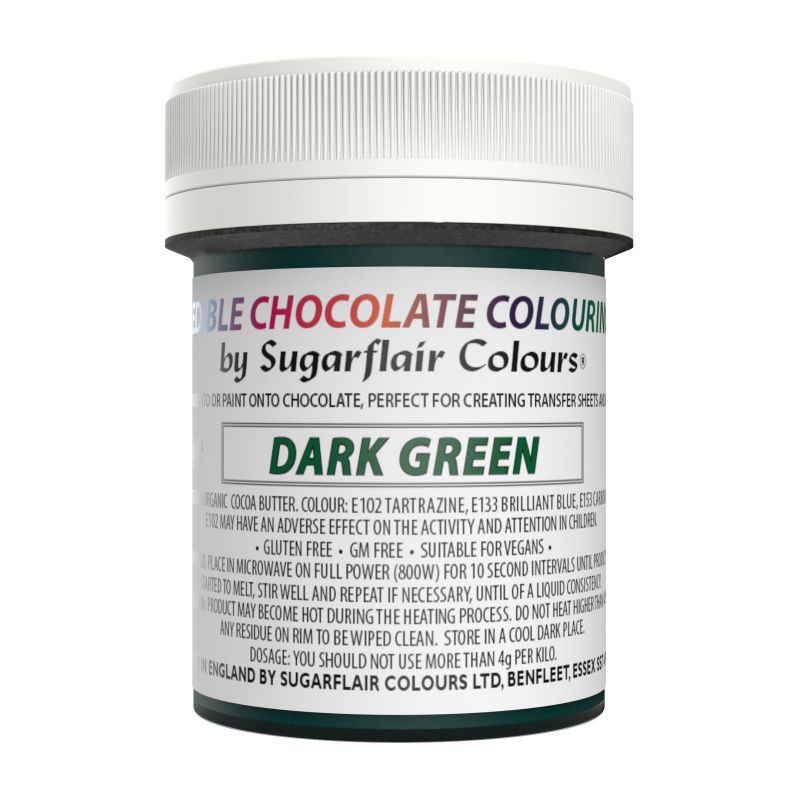 Schokoladenfarbe von Sugarflair ist ideal zum Verzieren eigener Transferfolien und zum Hinzufügen dramatischer Farben zu Schokoladenskulpturen allgemein. Diese Reihe wunderbarer Schokoladenfarben, hergestellt aus farbigem Kakaobutter, ist speziell darauf ausgelegt, der Schokolade Lebendigkeit zu verleihen. Sie sind vielseitig einsetzbar und einfach zu verwenden, sodass es leicht ist, handgefertigte Schokoladen herzustellen. Einfach in der Mikrowelle sanft erhitzen, damit die Farben schmelzen, und dann die Farbe über die Schokoladenform oder auf Pergamentpapier auftragen und farbige Muster erstellen, die Ihre Schokoladenarbeit verwandeln. Besonders gut funktionieren sie mit weißer Schokolade und erzeugen einen leuchtenden und ansprechenden Farbglanz. Farben einfach in temperierte weiße Schokolade mischen für eine einfache Möglichkeit, eine dramatische Note hinzuzufügen. Anwendungshinweis: Entfernen Sie den Deckel und Mikrowelle auf volle Leistung (800 W) für 10 Sekunden, bis der Inhalt zu schmelzen beginnt. Gut umrühren und wiederholen, bis er vollständig geschmolzen ist. Alternativ das Farbstoff in einem Topf im warmen Wasser schmelzen. Bitte beachten Sie, dass das Vorhandensein dieser Farbstoffe im Topf Alarm auslösen kann wegen „milchähnlicher Erscheinung“, weißer Flecken und runder Abdrücke auf der Kakao-Schokolade. Wir können Ihnen versichern, dass diese Markierungen keine Schimmelspuren sind und es sich um einen natürlichen Prozess der Trennung von Samen handelt, bekannt als Blumen der Kakaobutter oder „fettes Blüten“. Dieses „Blühen“ wird durch den Herstellungsprozess verursacht, wenn die Färbung abgekühlt oder temperiert wird, was unregelmäßige Kristalle bildet. Für das Wachstum von Schimmelsporen braucht Wasser und Schokolade wird als wasserfrei klassifiziert (enthält kein Wasser). Wenn Sie das Schokoladenfarbstoff erneut schmelzen, verschwinden die Spuren und er wird wie erwartet funktionieren und schmecken. Maximale Verzehrmenge: 4 g/kg.