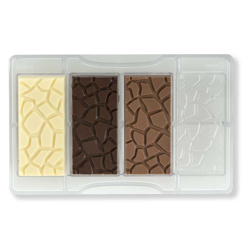 Komplette Serie grafischer Schokoladenmodelle umfasst eine Schokoladenform für Pralinen mit Schildkrötenpanzer-Motiv. Professionelle Formen aus Polycarbonat, das Material, dank dem die Schokoladen transparent und perfekt sind. Sie erstellen vier Stücke Schokolade auf einmal.