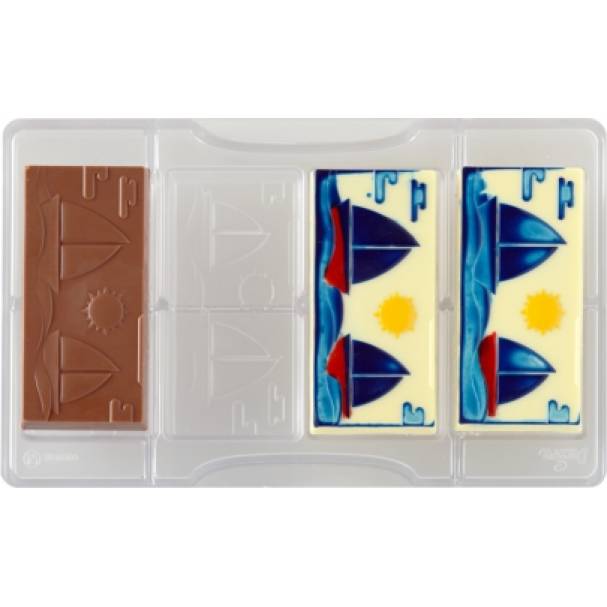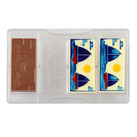 Komplette Reihe grafischer Schokoladenmodelle umfasst eine Schokoladenform für Pralinen mit Motiv Schiff. Professionelle Formen aus Polycarbonat, ein Material, das die Schokoladen transparent und perfekt macht. Sie stellen vier Stück Schokolade auf einmal her.