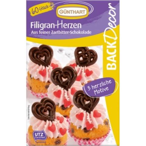Dekorative Schokoladenfiligranen in Form von Herzchen, die Ihre Kuchen- und Cupcake-Dekoration ergänzen. Verzieren Sie Ihre Kuchen stilvoll professionell mit bezaubernden Schokoladen-Vierblättern. Im Packung insgesamt 60 essbare Herzchen und 3 verschiedene Motive.