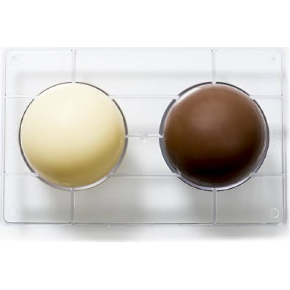 Professionelle Form für Schokolade aus italienischem Polycarbonat Decora. Mit der Form erzeugen Sie große Schokoladensphären. Wenn Sie die ganze Kugel möchten, können Sie zwei geformte Halbkugeln zusammensetzen oder zwei Schokoladenformen kaufen. Mit dem intelligenten Mechanismus an jeder Form verbinden sie sich leicht miteinander. Der Durchmesser der Kugel beträgt 10 cm.