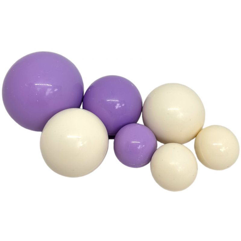 Satz Schokoladenkugeln, weiß und lila. Verpackung 7 Stück.