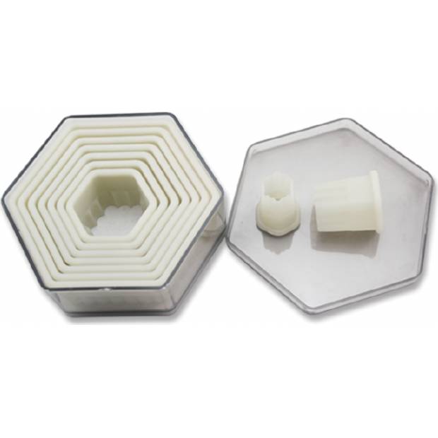Das Ausschneiden von Sechsecken war noch nie so einfach. Das Set enthält 9 verschieden große Sechsecke. Die ausgestochenen Sechsecke können Sie nach Belieben zusammenlegen und formen. Geeignet für Marzipan, Fondant, Gumpaste und weitere Backwaren.