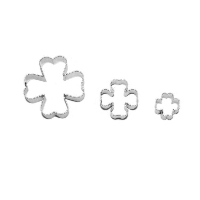 Sternförmchen mit scharfer Kante garantieren immer perfekte Ausstechungen aus allen Teigsorten. Sie bestehen aus beschichtetem Blech und das größte Kleeblatt hat die Maße 48 x 48 mm. Die Höhe des Blechs beträgt 16 mm.