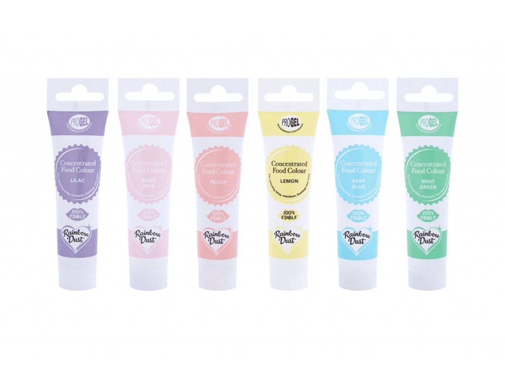 Mit Rainbow Dust Gel-Farben können Sie Ihre Fondant, Marzipan oder Buttercreme färben. Es reicht eine kleine Menge Lebensmittel-Farbstoff, damit Ihre Kreationen eine satte Farbe erhalten. Tuben, die länger halten, eignen sich auch zum Färben von Biskuit, Bonbons und mehr. Jedes Gel ist in einer farblich abgestimmten und sauberen Kunststofftube verpackt. Die Röhrchen enthalten unter Schraubverschluss einen Siegelstempel zur nachweisbaren Manipulationssicherheit. Einfach abziehen und das Gel aus der Tube drücken. Keine schmutzigen Behälter mehr, dank derer Ihre Werkzeugkiste voller Farbflecken wäre. Anwendung: Gel dem Fondant oder Marzipan hinzufügen und kneten, bis sich die Farbe verbindet. Gut durchkneten, bis die gewünschte Farbe erreicht ist. Nun ist der farbige Fondant oder Marzipan bereit für die Verwendung auf Ihrer Torte! Empfohlene Dosierung: 3 Gramm pro Kilogramm fertiges Produkt.
