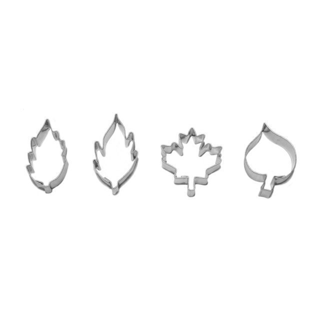 Ausstechformen für vier Blättchen unterschiedlicher Form in Größen von 2,1 bis 4,9 Zentimetern bestehen aus hochwertigem verzinntem Blech, das natürlich gesundheitlich völlig unbedenklich ist und aufgrund seiner glatten Oberfläche sich nach dem Gebrauch leicht reinigen lässt. Die gebackenen Blättchen können Sie nicht nur zusammenkleben, sondern laut Ihrer Fantasie auch mit Hilfe verschiedener Dekorationssets aus unserem Angebot verzieren.