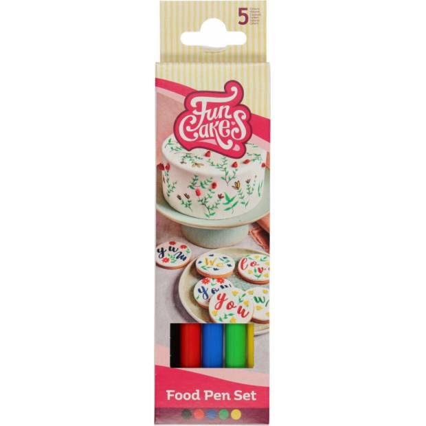 Zeichnen Sie schöne Details mit diesem speziellen Set grundlegender Farben FunCakes Food Pen. Das Set enthält Schwarz, Rot, Blau, Grün und Gelb und ist eine hervorragende Grundlage, um verschiedene bunte Details zu Ihren Kreationen hinzuzufügen. Die essbaren Marker sind mit 100% essbarem Tinteninhalt gefüllt, der verwendet werden kann, um kleine Details, Texte, Linien und weitere Dinge auf Kuchen, Cupcakes und Keksen zu erstellen. Die Pinselspitze hat eine flexible, biegsame Spitze für dünne und dicke Linien. Der Tintenfluss ist einfach und die Tinte trocknet schnell. Man kann direkt auf trockenen, harten oder halbtrockenen Oberflächen zeichnen, wie Fondant, Marzipan oder Zuckerteig. Ideal, um Ihre Leckereien mit Namen, Botschaften oder Datum zu personalisieren. Auch perfekt für die Erstellung von Augen, Mund und weiteren Details an modellierten Figuren sowie zum Anlegen von Stichen auf Blütenblättern und Blumen. Die FunCakes Food Pen-Reihe verleiht Ihren Kuchen ein außergewöhnliches Aussehen und Eindruck. Die Produkte sind in einer breiten Palette von Farben erhältlich und lassen sich einfach verwenden. Zur Verwendung in Lebensmitteln.
