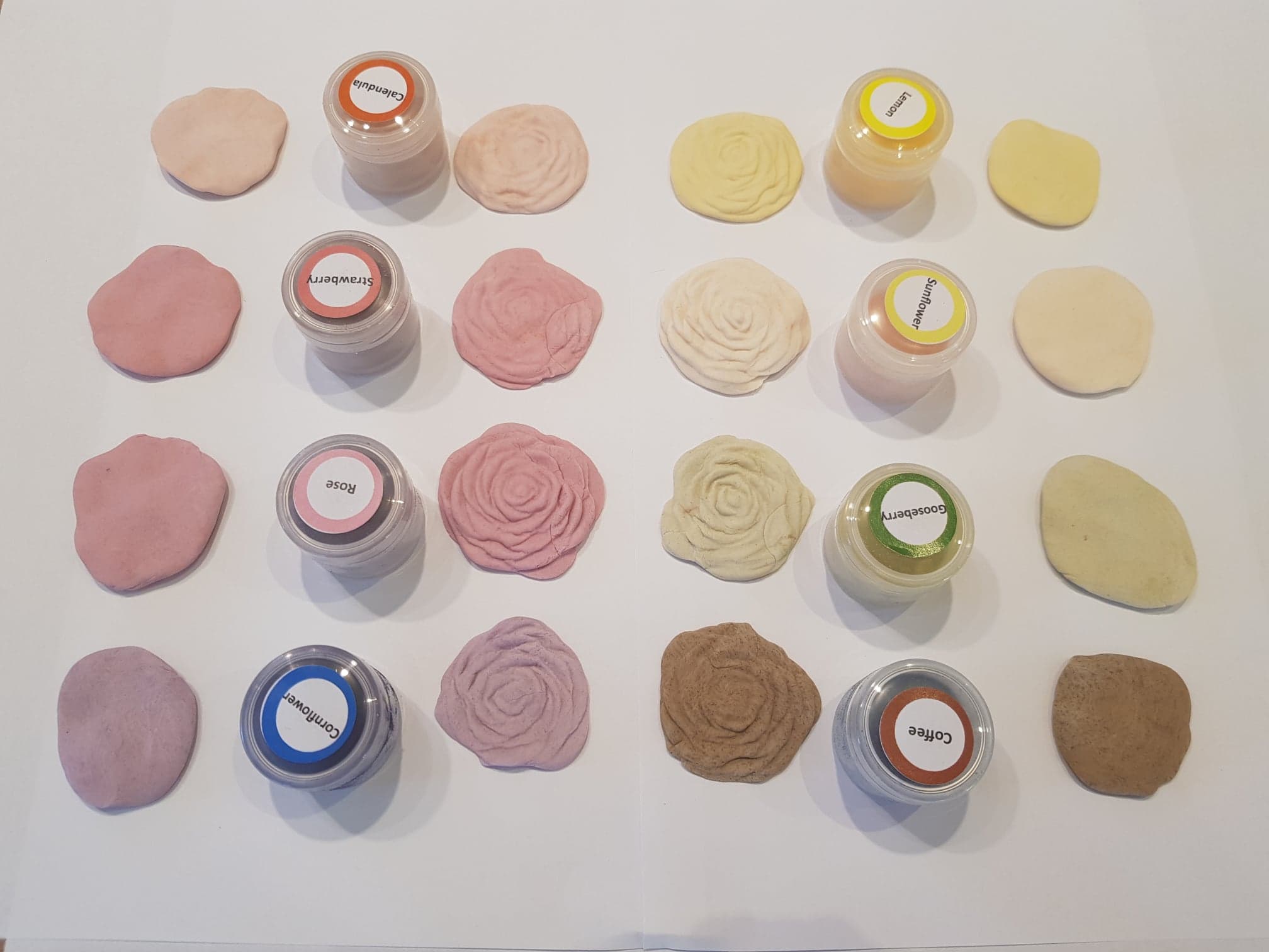 Diese natürlichen, kunststoffartigen Farben sind geeignet zum Färben von Oberflächen, Sie können sie aber auch zum Färben von Zuckermasche, Marzipan, Creme oder Teig verwenden. Da es sich um natürliche Farben handelt und sie keine chemischen Färbemittel enthalten, ist der erzielbare Farbton weniger intensiv – mit diesen Farben erreichen wir eher erdige Töne, nicht einen grellen, kräftigen Pastellton. Anwendung beim Färben von Oberflächen: Die Farbe kann nur mit der Spitze oder einem Schwämmchen trocken aufgetragen werden. In diesem Fall verwenden wir keine großen Mengen Farbe auf einmal; die trockene Farbe nimmt nicht auf und würde sich ansammeln – wenn Sie Farbe in größerer Menge auftragen, genügt es, sie leicht wegzublasen. Die Farbtöne werden sehr fein. Möchten wir intensivere Farben erzielen, verdünnen wir eine kleine Menge Farbpulver mit einem Tropfen Wasser oder Klaralkohol – manche Töne sind intensiver, wenn Wasser verwendet wird. Falls Sie jedoch wirklich Wasser verwenden, beachten Sie das Auftragen auf eine Modelliermasse, die keine Feuchtigkeit mag, und die Fläche könnte bei größerer Benetzung stärker gefärbt, verlaufen oder gar tropfen. Wenn Sie wirklich nur wenig Wasser verwenden, trocknet die Farbe und der resultierende Effekt sieht aus wie Nagellack zu malen – die Glanzeffekt bleibt auch nach dem Trocknen erhalten und sieht wirklich hübsch aus. Die Farben können auch in Zuckerpaste oder Marzipan verwendet werden – es genügt, eine kleine Menge Farbpulver schrittweise beim Kneten der Masse hinzuzufügen – der Farbton wird lebendig und verbindet sich während des Knetens zu einem Ton. Die resultierende Farbe ist nicht so intensiv – in einigen Fällen können ein paar pigmentierte Punkte zurückbleiben, unvermischte Farben. Eine intensivere Nuance wäre, wenn die Farbe erneut mit Wasser verdünnt würde; wenn Sie keine Erfahrung haben, empfehlen wir diesen Vorgang nicht, weil die Massen wirklich anfällig für Feuchtigkeit sind – Verdünnen muss wirklich sehr gering sein. Ein solcher Vorgang kann z. B. beim Färben der Teigkuchen verwendet werden. Wieder muss betont werden, dass es sich um natürliche Farben handelt und das Endergebnis nicht so stark sein muss wie bei Gel-Farben. Diese pastösen, natürlichen Farben sind für diejenigen geeignet, die natürliche, erdige Töne bevorzugen. Auf dem Bild sind Rosen, es handelt sich um weißen Zucker, der mit genau dieser pastösen Farbe eingefärbt wurde – unverdünnt. Auf farbigen Platten ist der Unterschied sichtbar, wenn die Farbe mit der Spitze auf die Oberfläche aufgetragen wird – hier ist die Farbe nur leicht mit Wasser verdünnt.