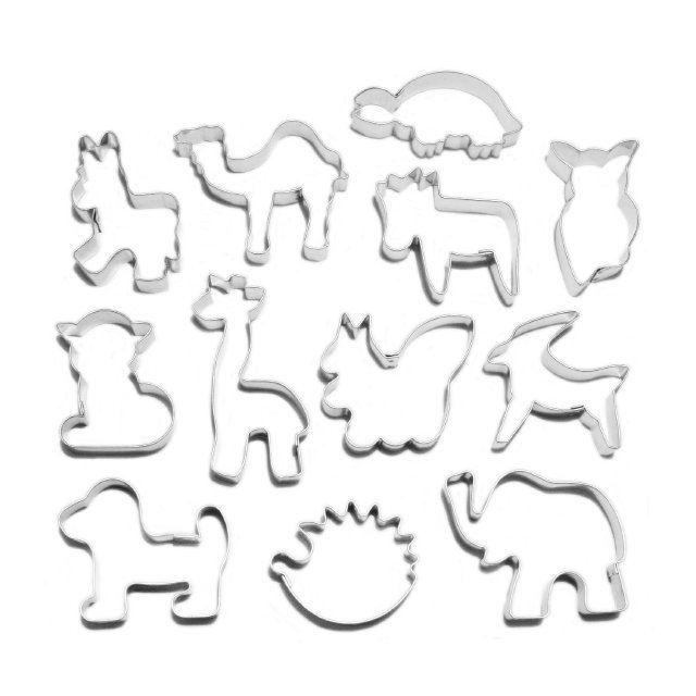 Perfekte Ausstechformen für die Zubereitung von Weihnachtsgebäck und Plätzchen für andere Anlässe. Durch die scharfen Kanten der Ausstechformen schneiden Sie aus allen Teigsorten immer die perfekte Form aus. Das Set enthält diese Ausstechformen: Hund, Igel, Elefant, Ziege, Eichhörnchen, Giraffe, Katze, Eule, Kuh, Kamel, Pferd und Schildkröte. Die Ausstechformen sind glatt und aus verzinntem Blech hergestellt. Die Abmessungen reichen von 25 bis 65 mm. Die Höhe des Blechs beträgt 16 mm.