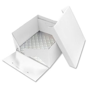 Tortenspiegel und Deckeldose/ -box sind ideale Lösungen für den Transport von Kuchen. Die Abmessung der Box beträgt 25,4 x 25,4 / 15,2 cm. Die Kuchenplatte ist mit der silbernen Box bezogen. Der Deckel sorgt für einen sicheren Transport des Kuchens. Aus Karton gefertigt.