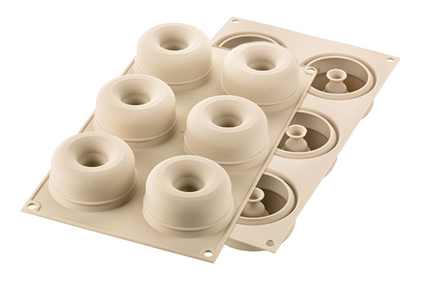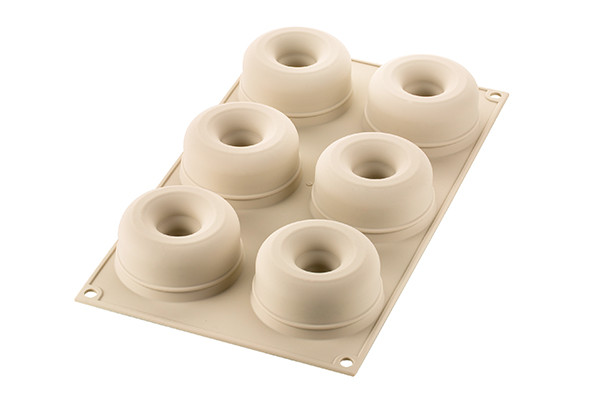 Kleine Schmuckstücke mit klassischen, zugleich zeitgenössischen Linien. MINI ARENA aus der 3D Silikomart-Serie ist eine außergewöhnlich vielseitige Form, eine originelle Neuinterpretation der traditionellen Donutform, um eine Explosion von Farben, Geschmack und Texturen zu schaffen. Die Aussparungen der Silikonform Mini Arena sind mit einem speziellen inneren Rand versehen, der der Basis Ihrer Gebäcke eine leicht abgerundete Form verleiht. Mini Arena garantiert makellose Ergebnisse nicht nur bei semifreddo und Schaum, sondern Sie können auch eine breite Palette von Konditoreiprodukten herstellen. Die Silikonform hat eine antihaftbeschichtete Oberfläche, wodurch das fertige Produkt leicht herausklappen lässt. Sie ist stapelbar, spülmaschinenfest. In ihr lassen sich gefrorene, gekühlte und mikrowellengeeignete Desserts zubereiten. Volumen 600 ml, Abmessungen 183 mm x 338 mm x 36 mm, Ø70. Die Form ist für 6 Donuts geeignet.