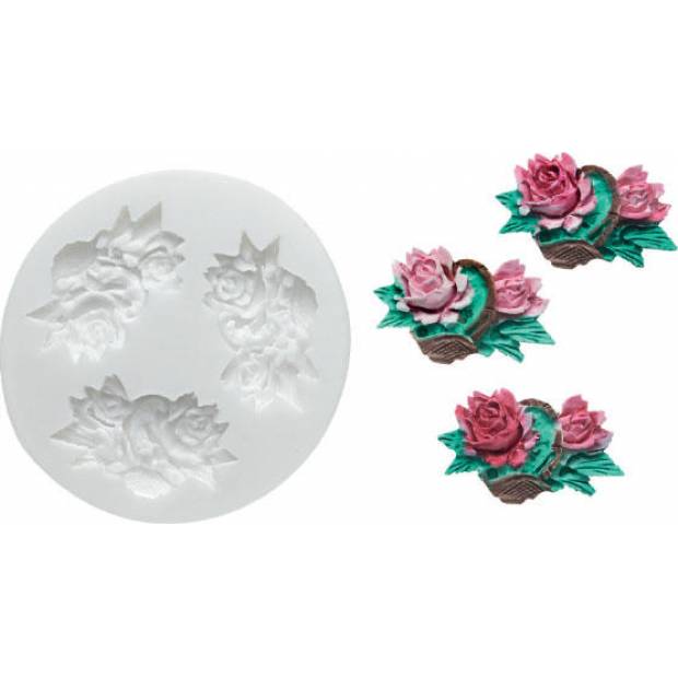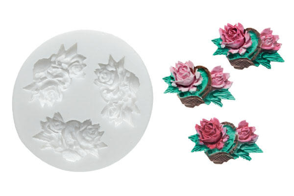 Formular für Dekorationen von Silikomart ist eine weiße Silikonform, mit der dekorative essbare Verzierungen hergestellt werden können. Die fertige Verzierung bildet drei Rosen im Korb. Die Form besteht aus Platin-Silikon. Die Silikomart-Form ist geeignet für Ofen, Kühlschrank, Gefrierschrank und Spülmaschine, hält Temperaturen von -60 °C bis +230 °C aus. Sie ist sowohl für professionelle Küchen und Hersteller als auch für den normalen Haushalt geeignet.