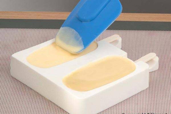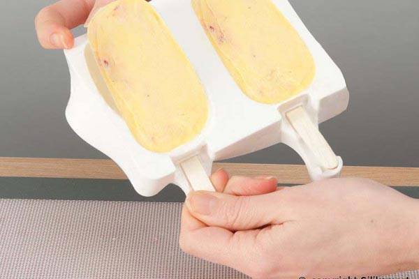 Diese Form ist nicht für Wassereis geeignet, die Mischung muss dick genug sein, damit keine Auslauf durch die Öffnung für den Stiel zum Eisbehälter entsteht.