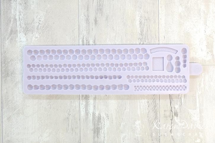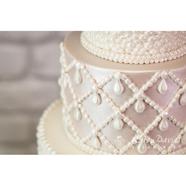 Diese Form zur Perlenherstellung von Karen Davies enthält sechs verschiedene Perlenränder und drei Perlen-Details. Ideal zum Dekorieren von (Hochzeits)Torten. Diese Form lässt sich leicht verwenden und sollte Teil jedes Werkzeugsets zum Tortendekorieren sein. Die Karen-Davies-Form ist flexibel und aus hochwertigem Silikon hergestellt. Vor dem Gebrauch die Form waschen und gründlich trocknen. Größe der Perlenränder: ca. 1,5 x 16 cm, 1 x 16 cm, 0,5 x 12,5 cm, 0,7 x 13,5 cm, 0,8 x 7,8 cm und 0,6 x 7 cm. Größe der Form: ca. 6,5 x 22 cm.