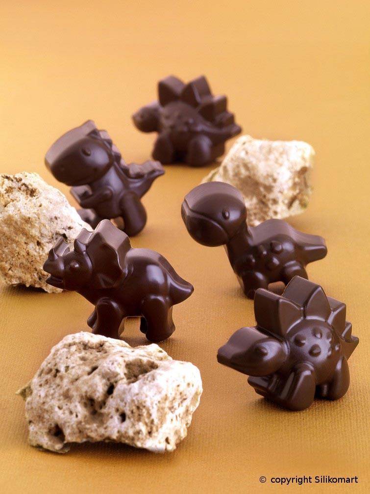 Formen mit fröhlichen Dinosaurierfiguren bietet sofort vier verschiedene Motive. Füllen Sie die Form mit geschmolzener Schokolade, entfernen Sie den Überschuss mit einem Spachtel und klopfen Sie die Form auf die Arbeitsfläche, damit sich keine Blasen in der Schokolade bilden. Lassen Sie die Schokoladenkugeln im Kühlschrank aushärten (die Form hält Temperaturen bis -60 °C aus). Dank der Antihaftbeschichtung und der Flexibilität des Silikons lassen sich die Bonbons immer mühelos herausschneiden. Die Form können Sie in der Spülmaschine reinigen.