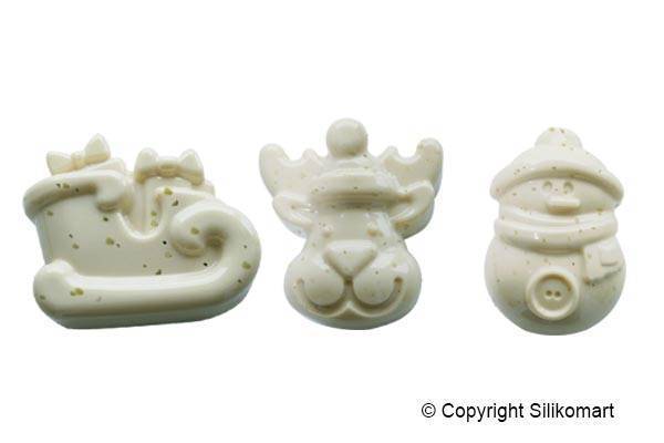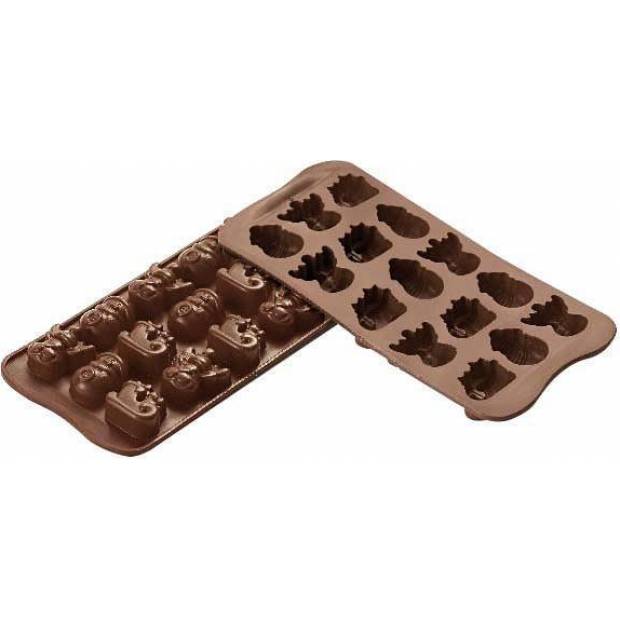 Fröhliche Weihnachtsmotive von Rentier, Schneemann und Schlitten erhellen den Weihnachtstisch. Fülle die Form mit geschmolzener Schokolade, wische überschüssiges Material ab und klopfe die Form auf die Arbeitsplatte, damit keine Blasen in der Schokolade entstehen. Lasse die Schokoladenstücke fest werden und stelle die Form in den Kühlschrank (die Form hält Temperaturen bis -60°C aus). Die einzelnen Figuren sind schön verziert und dank der Antihaftbeschichtung und der Flexibilität des Silikons lässt sie sich immer leicht lösen. Die Form kann in der Spülmaschine gereinigt werden.