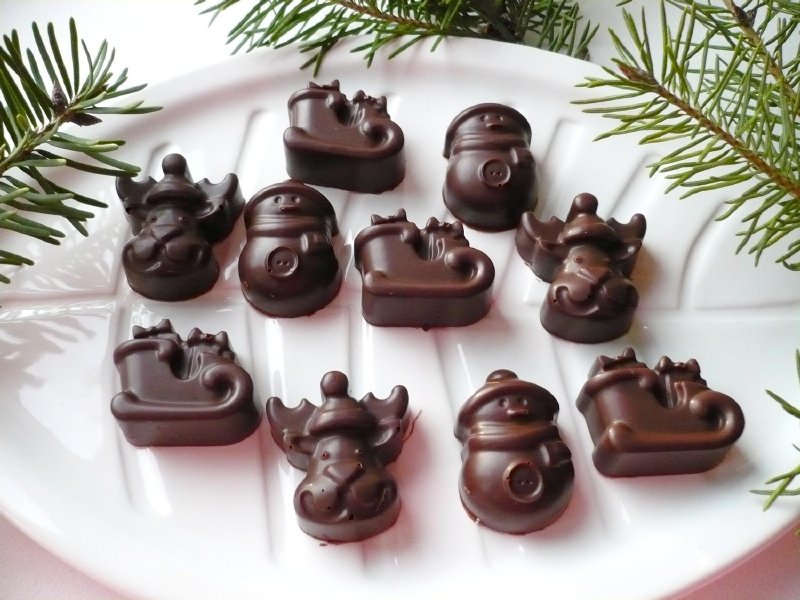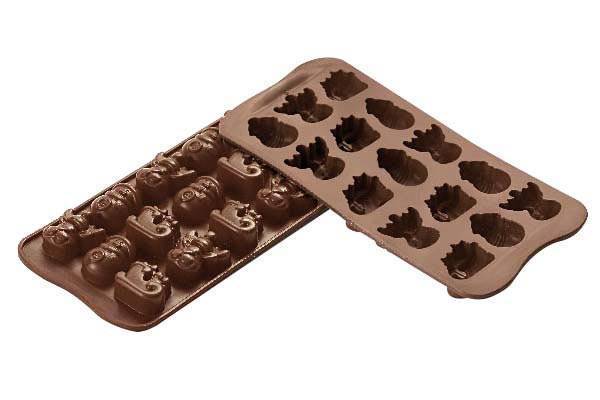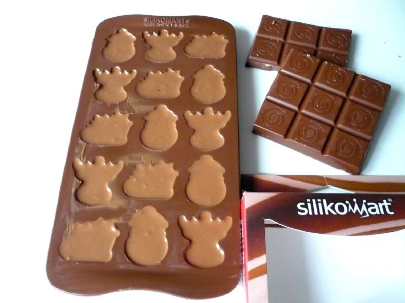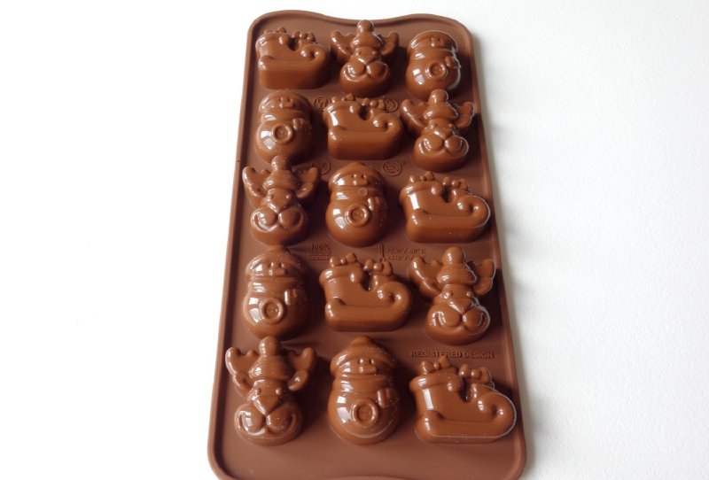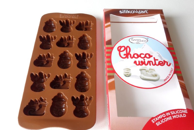 Silikonformen für Schokolade der Marke Silikomart zeichnen sich durch ihre Qualität aus. Ich verwende sie sehr gern und bin mit dieser Marke sehr zufrieden. Im Angebot des Onlineshops gibt es viele verschiedene Arten, und jeder wählt eine Form nach seinen Bedürfnissen und Anforderungen. Diese Form hat ein weihnachtliches Motiv und eignet sich sowohl zur Herstellung von Pralinen als auch vor allem zum Ausgießen kleiner Schokoladen. Die Schokoladenstücke werden besonders Kindern gefallen. Schokoladen und Pralinen werden sicherlich die Dekoration des Weihnachtstischs sein, können aber auch als geeignetes Geschenk dienen. Wenn wir Schokoladen ohne Füllung vorbereiten, benötigen wir zur Füllung der Form ca. 150 g Schokolade. Am besten verwenden wir Schokolade in Tropfen-/Papel-Fahlenform, aber das ist kein Muss. Man kann auch Tafelschokolade verwenden, die grob gehackt wird. Schokolade muss vor der Verwendung geschmolzen und temperiert werden, je nach Art der verwendeten Schokolade. Man kann entweder ein elektrisches Temperiergerät verwenden, ein Topf mit einem Wasserbad oder eine Silikon-Schüssel zum Erwärmen der Schokolade mit einem Sieb. Sie ist geeignet für die Mikrowelle oder auch für ein normales Wasserbad. Wer häufiger mit Temperieren arbeitet, dem empfehle ich zusätzlich ein Thermometer. Alles ist in diesem Onlineshop erhältlich.