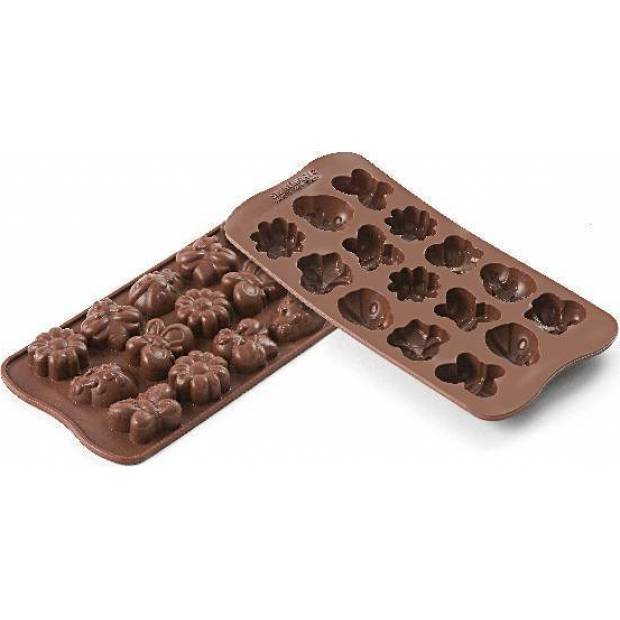 Form enthält vier Motive: Schmetterlinge, Bienen, Marienkäfer und Blumen. Gießen Sie die geschmolzene Schokolade in die Form, wischen Sie den Überschuss mit einem Spachtel ab und klopfen Sie die Form auf die Arbeitsplatte, damit keine Blasen in der Schokolade entstehen. Lassen Sie die Schokoladenstücke im Kühlschrank fest werden (die Form hält Temperaturen bis -60°C aus). Dank der Antihaftbeschichtung und der Flexibilität des Silikons lassen sich die Bonbons immer leicht herauslösen.