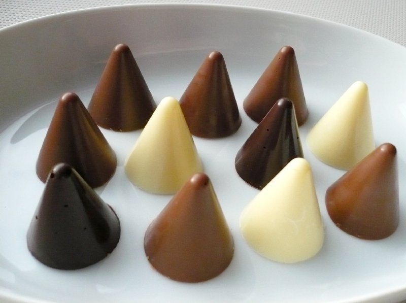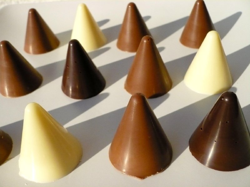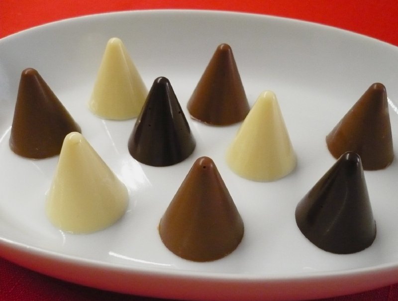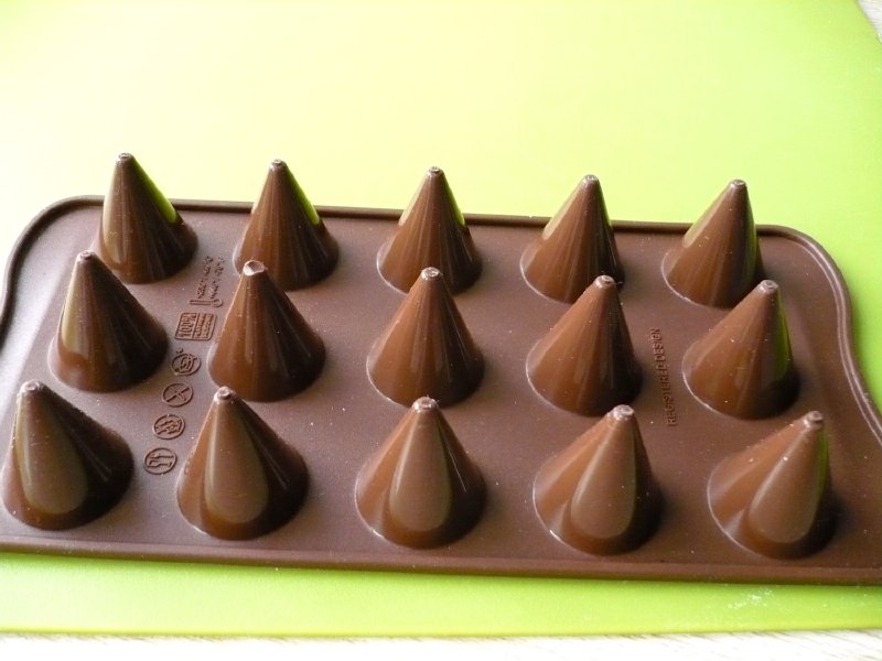 Schokoladenkegel können Sie als Dekoration für Torte verwenden oder einfach so essen. In die Form passen 112,5 ml Schokolade. Gießen Sie die geschmolzene Schokolade in die Form, überstehenden Überschuss am Spachtel ab und klopfen Sie die Form auf die Arbeitsplatte, damit keine Blasen in der Schokolade entstehen. Die Schokoladenkegel lassen Sie im Kühlschrank fest werden (Form hält Temperaturen bis -60°C aus). Dank der Antihaft-Eigenschaften und der Elastizität des Silikons lassen sich die Bonbons immer leicht lösen und sie haben stets eine glatte, glänzende Oberfläche.