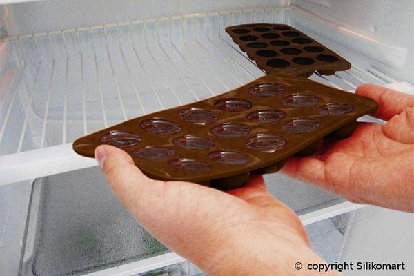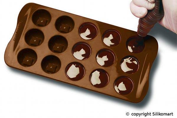 Auf diese Weise stellen Sie lustige Figuren her, die Modebegeisterte erfreuen. Das Formvolumen beträgt 96 ml und die Abmessungen der einzelnen Bonbons sind 4x3x1,2 cm. Die Figuren können Sie als Dessert zu Kaffee servieren oder sie zur Dekoration einer Torte verwenden. Gießen Sie geschmolzene Schokolade in die Form, entfernen Sie überschüssiges Material mit einer Spachtel und klopfen Sie die Form auf die Arbeitsplatte, damit sich keine Bläschen in der Schokolade bilden. Lassen Sie die Schokolade im Kühlschrank fest werden (die Form hält Temperaturen bis zu -60 °C aus). Dank der Antihaft- und Elastizität des Silikons lässt sich das Bonbon stets leicht lösen.