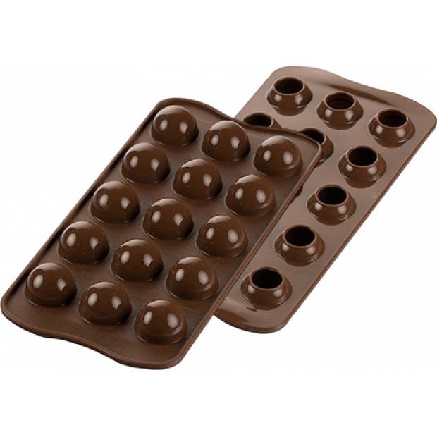 Silikonform für Schokoladenkugeln. Silikon ist ein formbares Material, das das einfache und schnelle Auslösen der fertigen Kugeln ermöglicht; außerdem klebt keine Schokolade an der Oberfläche der Form. Die Schokoladenform kann im Ofen, Gefrierschrank und in der Mikrowelle verwendet werden. Versuchen Sie, darin auch Gelée herzustellen.