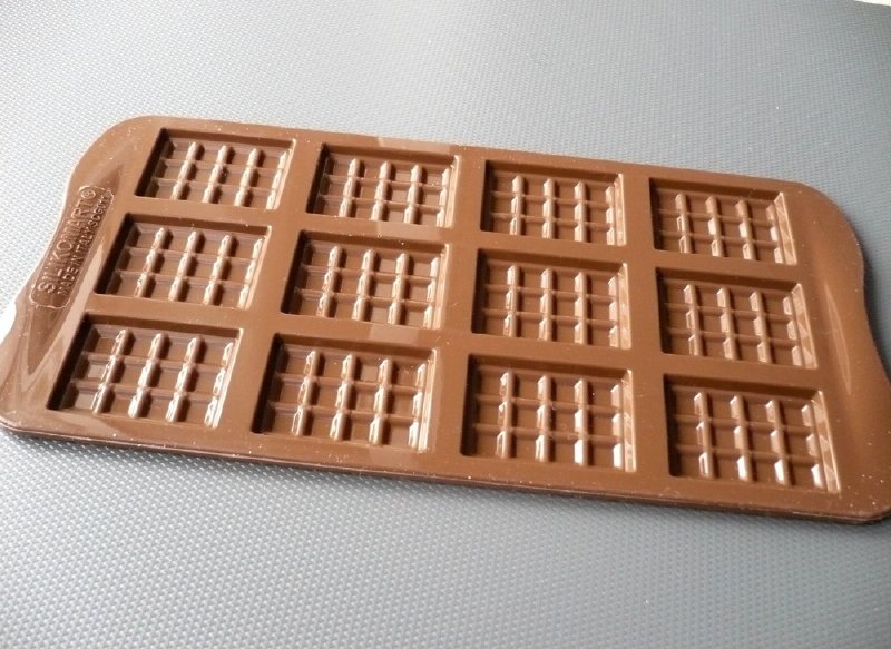 Hochwertige Silikonform für 12 Mini-Schokoladentafelnchen. Volumen: 44 ml.
