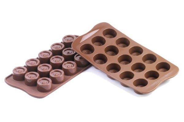 Forma VERTIGO hat an der Spitze jeder Bonbons Spirale, durch die du eine schön verzierte Leckerei erhältst. Fülle die Form mit geschmolzener Schokolade, wische überschüssige Schokolade ab und klopfe die Form vorsichtig mit dem Arbeitsbrett ab, damit sich keine Blasen in der Schokolade bilden. Lass die Schokolade im Kühlschrank fest werden (die Form hält Temperaturen bis -60°C aus). Die Form ist sehr flexibel, aus hochwertigem Silikon, das nicht reisst. Du kannst die Form in der Spülmaschine reinigen.