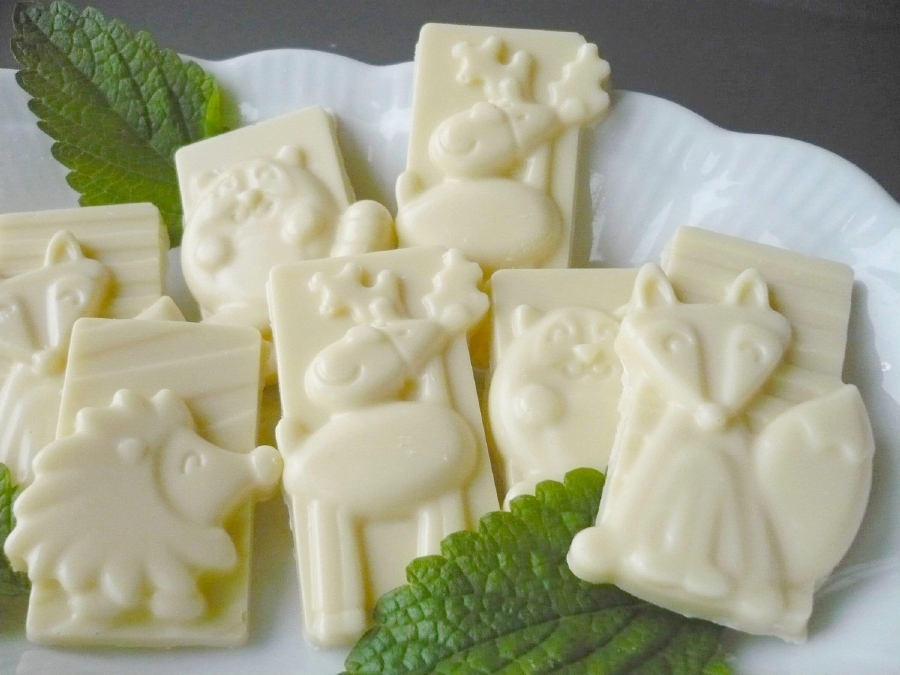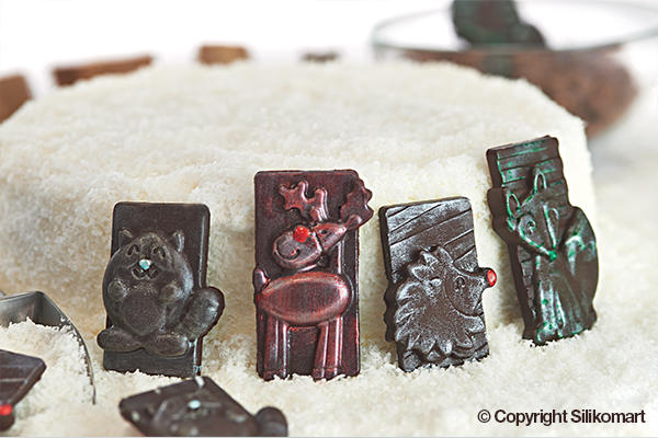 Silikonform zur Zubereitung von Mini-Schokoladentafeln mit Motiven von weihnachtlichen Tieren.