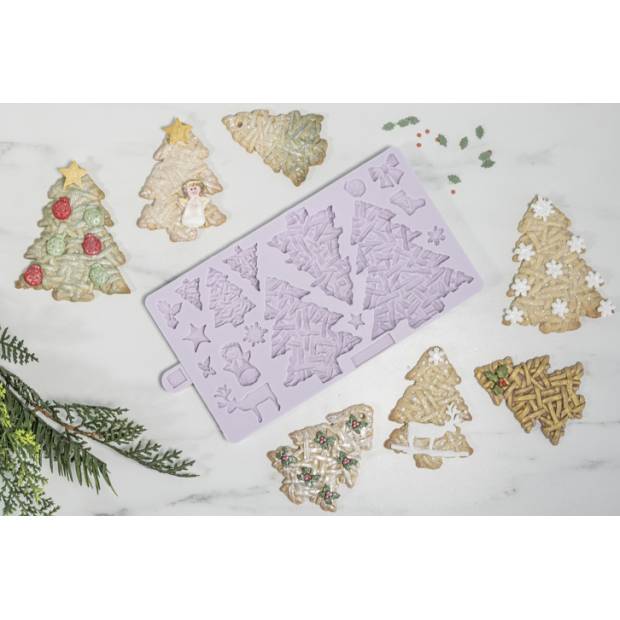 Erstellen Sie schöne Korb-Stämmchen schnell und einfach mit einer Silikonform. Die Form enthält verschiedene Größen von Weihnachtsbäumen. Zur Verzierung von Körbchen, Plätzchen und Kuchen verwenden Sie Fondant, Marzipan, Zuckermasse, Plätzchenteig und mehr. Ideal für Weihnachtsfeiern und -dinner! Die Karen Davies Formen sind detailliert, flexibel und aus hochwertigem Silikon gefertigt. Anleitung: Marzipan oder Fondant gut durchkneten. Bei Bedarf Fondant mit etwas Tylo-Pulver mischen. Eine Kugel formen und Marzipan bzw. Fondant von innen nach außen gut in die Form drücken. Anschließend die Form herausnehmen. Falls nötig, die Form vorher leicht mit Maisstärke bestäuben, damit Fondant/Marzipan leichter aus der Form kommt. Vor dem Gebrauch die Form gründlich reinigen und trocken tupfen. Geeignet für Zuckerguss, Blütenpaste, Plätzchenteig, Backwaren, Marzipan, Modellierpaste, Schokolade, Gebäck, gekochten Zucker, salzigen Teig, lufttrocknende Tonpasten, Fimo bzw. Tonmasse, kaltes Porzellan und Embossing-Puder. Abmessung der Form: 21 x 12 cm.