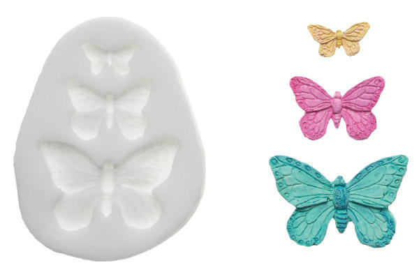 Formen Sie ganz einfach mit dieser Silikonform feine Schmetterlinge. Die Produkte aus dieser Form sehen als Dekoration auf der Hochzeitstorte gut aus. Sie werden mit Zuckerpaste oder Fondantmasse verwendet. Mit den Formen arbeitet man sehr gut. Drücken Sie die Masse gleichmäßig nach innen, glätten Sie sie gleichmäßig mit einem Nudelholz. Entfernen Sie überschüssige Masse und lösen Sie dann die Masse von den Rändern, damit sie aus der Form kommt. Basteln Sie die fertige Verzierung auf einer trockenen und sauberen Oberfläche.