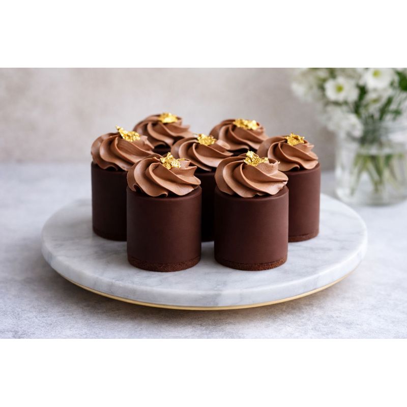Zuerst füllen wir die Gläser mit Bolero-Mischung (den dunklen Teil, den wir im Kühlschrank fest werden lassen). Danach lösen wir sie aus der Form. Die so vorbereitete Glasform tauchen wir in geschmolzene Schokolade, damit nicht zu viel ins Innere läuft, wo anschließend nach dem Aushärten die Topmix (Likörcreme) gefüllt wird.