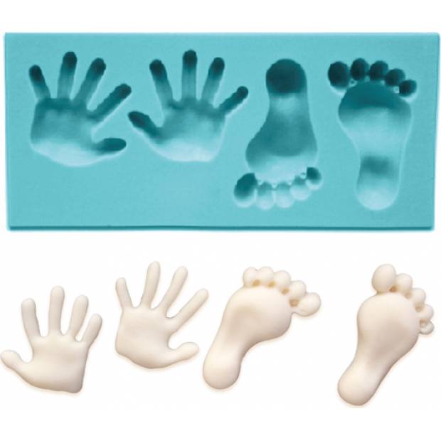Silikonform für Füße und Hände. Nach dem Füllen der Masse und dem Entfernen der Dekore aus der Form erhalten Sie ein perfekt geformtes Produkt. Fertige Werke können Sie mit Streudekor, Zuckerguss oder essbarem funkelndem Gel verzieren. Die Form ist aus gesundheitlich unbedenklichem Silikon hergestellt, das für den Kontakt mit Lebensmitteln vorgesehen ist. Spülmaschinenfest.