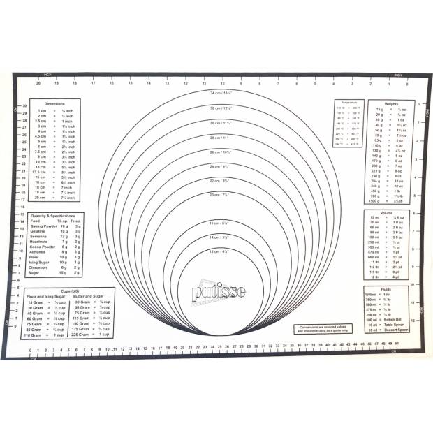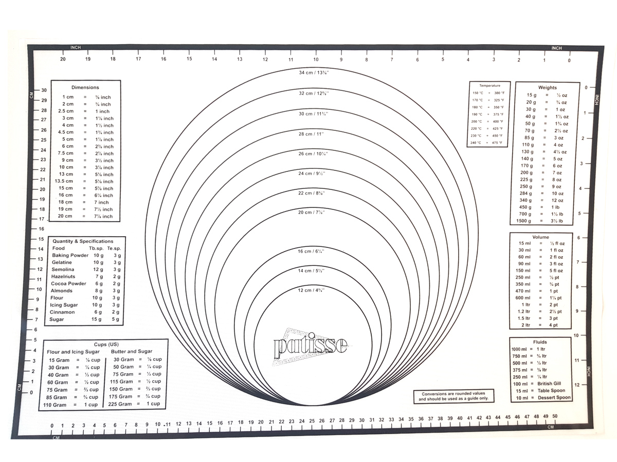 Silikon-Backunterlage Patisse ist eine praktische Backunterlage, die sich ideal zum Ausrollen von Fondant-, Marzipan- oder Keksenteig eignet. Die Backunterlage zeigt Maße an, sodass das Ausrollen der gewünschten Größe leichter ist.