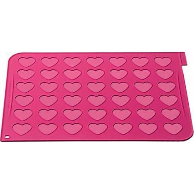 Die Silikonform ist temperaturbeständig von -60°C bis +230°C, also sehr haltbar und außerdem antihaftbeschichtet - sie muss vor dem Backen nicht eingefettet werden. Die Flexibilität von Silikon sorgt dafür, dass sich die Makronen leicht ablösen lassen. Die Form kann zur einfachen Aufbewahrung aufgerollt werden. Die Maße der Form sind 30 x 40 cm, ein Herz hat einen Durchmesser von 3,5 cm.