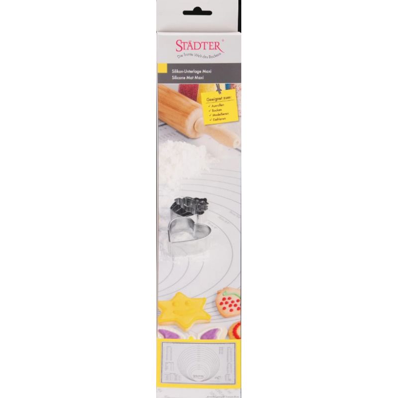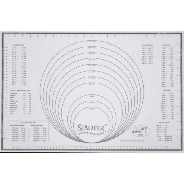 Eine Unterlage der bewährten Marke Städter mit den Maßen 60 x 40 cm ist aus flexiblem Silikonmaterial gefertigt, das antihaftend ist und Temperaturen herkömmlicher Backöfen standhält. Dadurch bereiten Sie darauf Zuckerteige, Linzerspeisen, Marzipan, Fondant oder anderes Backwerk zu, ohne Angst vor dem Ankleben — die Zutaten lösen sich leicht, und die Unterlage lässt sich anschließend einfach reinigen oder nur abwischen. Die Silikonauflage schützt außerdem die Arbeitsfläche vor Stauben mit Mehl oder anderem Unordnung, was besonders beim häufigen Backen und Arbeiten mit Teig von Vorteil ist.