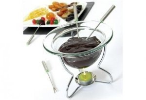 Einfaches und kleines Fondueset mit vier Gabeln. Das Glasfondue ermöglicht es Ihnen, heiße köstliche Schokolade zu genießen.