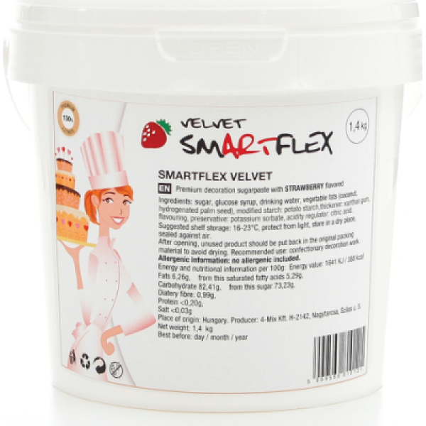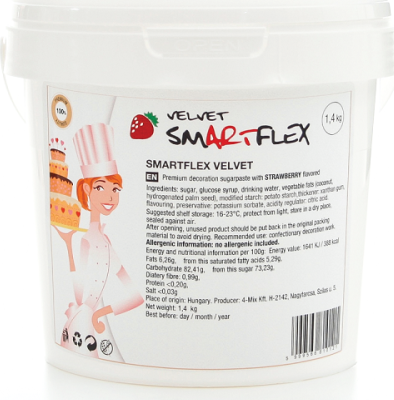 Die mit natürlichem Aroma aromatisierte Erdbeer-Zuckerpaste ist sehr elastisch, formstabil und klebt überhaupt nicht. Sie können damit auch große Dekorationen modellieren, die nicht auseinanderfallen, und sie ist auch zum Überziehen geeignet. Sie können die schneeweiße Masse in Ihrem Wunschfarbton einfärben.