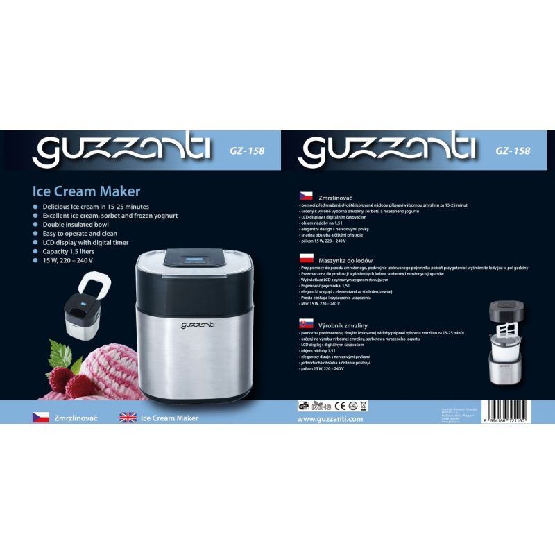 Eismaschine Guzzanti GZ 158 bereitet mit einem vorgemrigten, doppelt isolierten Behälter herausragendes Eis in 15–25 Minuten zu, geeignet zur Herstellung von ausgezeichnetem Eis, Sorbets und Frozen Yogurt LCD-Display mit digitalem Timer Behältervolumen 1,5 l elegantes Design mit Edelstahl-Elementen einfache Bedienung und Reinigung des Geräts Leistung 15 W, 220 – 240 V