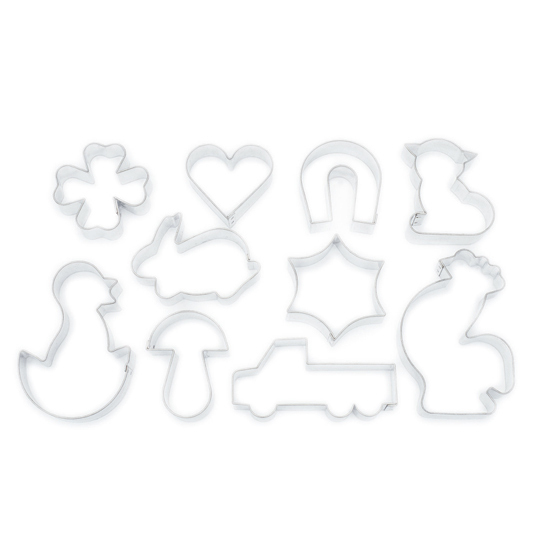 Schule mit Spiel und Spaß, das gilt auch beim Ausstechen einfacher Formen und Symbole aus Teig, Marzipan oder Fondant. Für Kinder sind diese Formen vertraut, und wenn sie bei der Herstellung oder dem Dekorieren zusammenarbeiten, prägen sie sie sich auch mit ihren Bezeichnungen ein und erhalten so neben der Süße auch weitere Begriffe in ihren wachsenden Wort- und Sinnesbestand sowie Formen. So lernen sie leicht, zum Beispiel Herzchen, Kleeblatt, Sternchen, Pilz, Hahn, Häschen, Küken, Auto, Katze und Hufeisen zu benennen. Die fertigen Formen werden in mittlerer Größe sein – von 78 bis 36 mm.