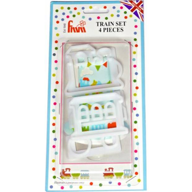 Satz von 4 praktischen Ausstechformen mit dem Motiv einer Lokomotive.