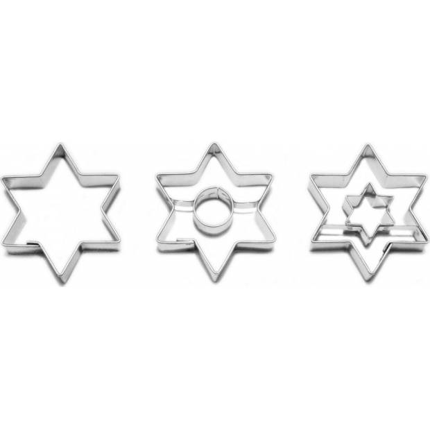 Aussstiche haben die Maße 40 × 46 mm. Eines ist glatt, zwei davon verfügen über eine Mitte (Kreis und winziger Stern), sie eignen sich perfekt für die Zubereitung von beidem bedrucktem Backwerk. Die Ausstecher bestehen aus verzinntem Blech. Die Blechhöhe beträgt 16 mm.