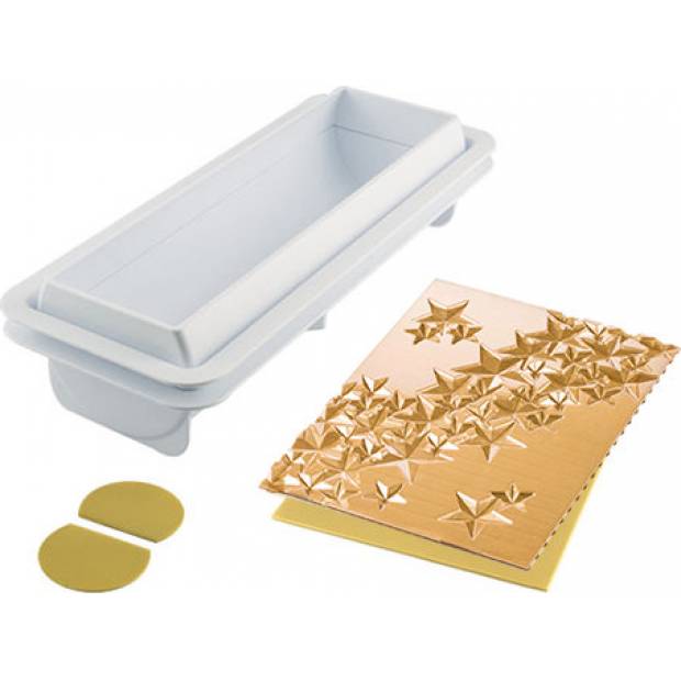 Silikonform besteht aus einem Kunststoffträger, in den eine der beiden Silikonmatten eingesetzt wird. Das Set besteht aus der Form und zwei Matten, einer glatten und einer mit Sternen. So können Sie beliebige Desserts und Rollen mit dekorierter Oberfläche herstellen. Volumen 1200 ml. Abmessungen: 80 x 250 x 67 mm.