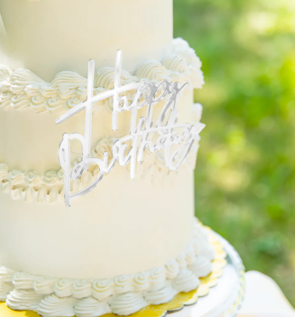 Verschönern Sie Ihre Festkuchen mit einem stilvollen Accessoire – dem „Happy Birthday“-Zweck von Party Pal. Diese silberne Spiegeldekoration in Form eines Schriftzuges besticht durch schlichte Eleganz und verleiht Ihrem Dessert ein beeindruckendes Aussehen. Sie ist so konzipiert, dass sie elegant am Rand des Kuchens platziert wird und der Feier eine anspruchsvolle und moderne Note verleiht.